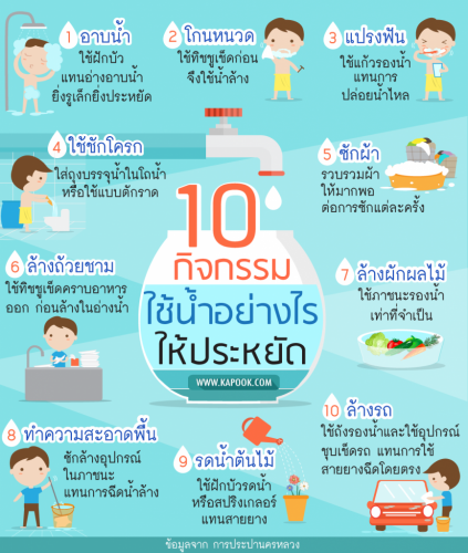 รายละเอียด : วิธีประหยัดน้ำ เพื่อช่วยกันอนุรักษ์ทรัพยากรน้ำ ให้มีไว้ใช้ได้นานจนถึงรุ่นลูกหลาน แถมยังประหยัดเงินค่าน้ำที่ต้องจ่ายในแต่ละเดือน 10 วิธีประหยัดน้ำ เริ่มทำได้ง่าย ๆ เริ่มจากที่บ้าน 1. เช็คท่อน้ำและก๊อกน้ำ น้ำหยดเล็ก ๆ จากท่อน้ำหรือก๊อกน้ำที่ติดตั้งไม่แน่นนั้น ถ้าปล่อยทิ้งไว้โดยไม่ซ่อมแซมในแต่ละวันนั้นจะสูญเสียน้ำไปประมาณ 75 ลิตร และถ้าท่อน้ำมีขนาดใหญ่จะเสียน้ำไปโดยเปล่าประโยชน์ถึง 387 ลิตร คิดูสิคะว่ามันมากมายแค่ไหน 2. ไม่ทิ้งขยะลงชักโครก การทิ้งขยะลงชักโครกนอกจากจะเป็นสาเหตุที่ทำให้ชักโครกตันแล้วยังเป็นการสิ้นเปลืองน้ำอีกด้วย ไม่ว่าจะเป็นผ้าอนามัย กระดาษชำระ หรือก้นบุหรี่ที่ถูกท้งลงไป จะต้องใช้น้ำปริมาณมากทีเดียวในการชำระล้างไม่ให้เหลือซาก 3. ตรวจเช็คถังเก็บน้ำชักโครกเสมอ หากถังเก็บน้ำชักโครกรั่วจะทำให้มีน้ำไหลลงชักโครกอยู่ตลอดเวลา ฉะนั้นแล้วควรหมั่นตรวจเช็คเป็นประจำ โดยการใส่สีผสมอาหารลงไปในถังเก็บน้ำชักโครกแล้วกดน้ำทิ้ง และหลังจากกดน้ำไปแล้วประมาณ 30 วินาทียังมีน้ำไหลออกมา แสดงว่าถังเก็บน้ำชักโครกชำรุด ต้องรีบซ่อมแซมโดยด่วน 4. ปิดน้ำระหว่างแปรงฟัน หลาย ๆ คนมักจะเผลอเปิดน้ำขณะแปรงฟัน เพราะคิดว่าคงจะไม่สิ้นเปลืองอะไรมากมาย โดยที่ไม่รู้เลยว่าการทำเช่นนี้ทำให้เสียน้ำไปถึง 200 แกลลอนหรือ 757 ลิตรโดยเปล่าประโยชน์ ซึ่งเทียบเท่ากับสะรขนาดใหญ่ที่สามารถใช้เลี้ยงฉลามได้ถึง 6 ตัวเลยทีเดียว 5. ปิดน้ำระหว่างถูสบู่ จะเปิดน้ำทิ้งไปทำไมหากในระหว่างที่สระผมหรือถูสบู่ไม่จำเป็นต้องใช้น้ำอยู่แล้ว ฉะนั้นจึงควรปิดน้ำให้สนิทเสียก่อน แล้วค่อยเปิดน้ำอีกครั้งหลังจากชำระร่างกายด้วยสบู่เสร็จ 6. ซักผ้าครั้งละมาก ๆ การซักผ้าครั้งละน้อยชิ้นจะทำให้สิ้นเปลืองน้ำมากเพราะต้องทยอยซักเรื่อย ๆ ซึ่งเมื่อนำปริมาณน้ำซักผ้ามาคิดรวมกันแล้วจะมากกว่าการซักครั้งเดียวรวมกันหลายเท่า ฉะนั้นแล้วควรเก็บไว้ซักพร้อมกันอาจจะซักผ้าแค่ 1 หรือ 2 ครั้งต่อสัปดาห์ 7. อาบน้ำให้เร็วขึ้น เพราะในการอาบน้ำแค่ 4 นาทีเท่ากับการใช้น้ำไป 75–150 ลิตร ซึ่งถ้าอาบนานกว่านี้ปริมาณของน้ำที่ต้องใช้ก็จะเพิ่มขึ้นตามไปด้วย ฉะนั้นแล้วควรอาบน้ำให้เร็วขึ้นอีกนิด ใช้เวลาให้น้อยลง เพื่อช่วยกันประหยัดทรัพยากรน้ำไว้ใช้ในภายภาคหน้า 8. อาบน้ำโดยใช้ฝักบัว หลายคนคงชอบนอนแช่ในอ่างอาบน้ำ แต่หลังจากนอนแช่ในอ่างเสร็จก็ต้องมาล้างตัวด้วยน้ำสะอาดอีกรอบอยู่ดี ซึ่งเท่ากับว่าใช้น้ำเป็น 2 เท่าเลยทีเดียว ฉะนั้นเปลี่ยนมาอาบน้ำโดยใช้ฝักบัว