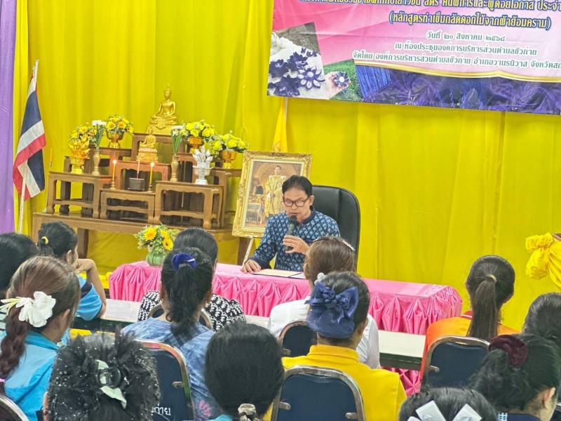 รายละเอียด : เมื่อวันที่ 20เดือนสิงหาคม พ.ศ. 2568 นายสุรศักดิ์ โพธิ์ศรี นายกองค์การบริหารส่วนตำบลขัวก่าย เป็นประธานเปิดโครงการฝึกอบรมอาชีพให้กับเยาวชน สตรี คนพิการและผู้ด้อยโอกาส ประจำปี พ.ศ. 2568 (หลักสูตรทำเข็มกลัดดอกไม้จากผ้าย้อมคราม) ณ ห้องประชุมองค์การบริหารส่วนตำบลขัวก่าย วัตถุประสงค์ เพื่อเป็นการฝึกทักษะอาชีพให้กับเยาวชน สตรี คนพิการและผู้ด้อยโอกาส และเป็นการส่งเสริมการสร้างอาชีพเสริมและสร้างรายได้ให้แก่ตนเองและครอบครัว ในการนี้ มีกลุ่มเป้าหมาย คือเยาวชน สตรี คนพิการและผู้ด้อยโอกาสในตำบลขัวก่าย จำนวน 65 คน